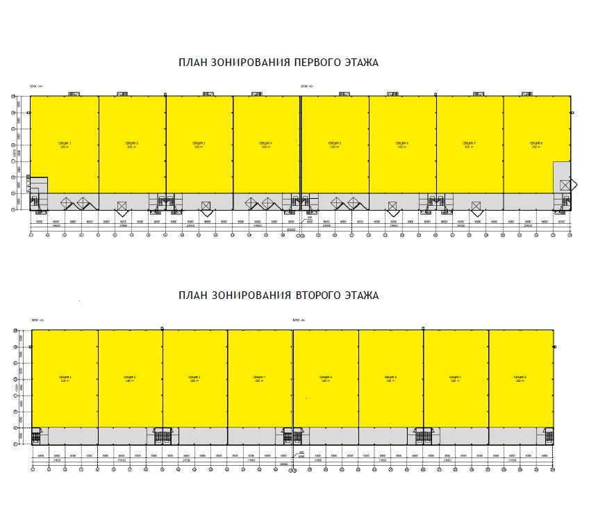Площадь здания: 9 340 м², Площадь одной секции: 1 170 м² из которых Производственная: 990 м² Офисная: 180 м² Рабочая высота потолков: 8 м Шаг колонн: 12х24 Антипылевыеполы, нагрузка: 6 т/м² Доковые ворота: 1 док на 500 м² Электроснабжение: 20 кВт на 1000 м² (увеличение до 3 мВт) Система пожаротушения и оповещения Офисные помещения с отделкой, Сухой склад (+18)